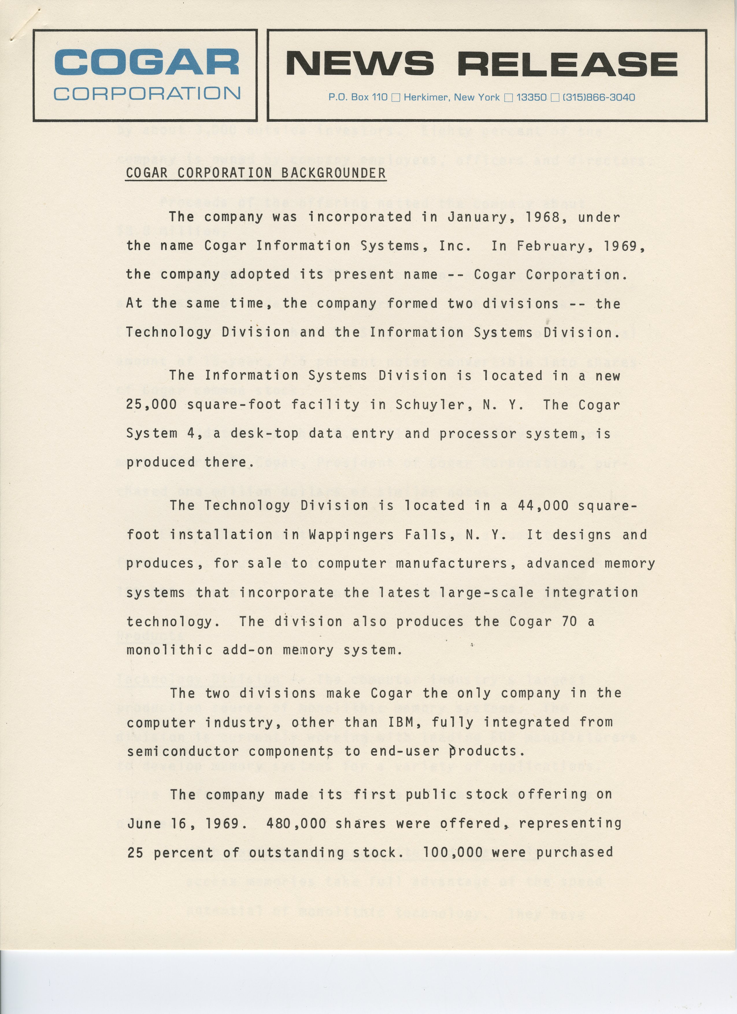 Cogar Coporation Background